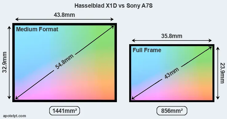 Of the two cameras under consideration, the Hasselblad X1D features a medium format sensor and the Sony A7S a full frame sensor. The sensor area in the A7S is 41 percent smaller. As a result of these sensor size differences, the cameras have a format factor of, respectively, 0.79 and 1.0. The sensor in the X1D has a native 4:3 aspect ratio, while the one in the A7S offers a 3:2 aspect.