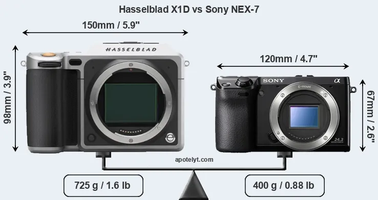 If the front view area (width x height) of the cameras is taken as an aggregate measure of their size, the Sony NEX-7 is considerably smaller (45 percent) than the Hasselblad X1D. Moreover, the NEX-7 is substantially lighter (45 percent) than the X1D. It is worth mentioning in this context that the X1D is splash and dust resistant, while the NEX-7 does not feature any corresponding weather-sealing.