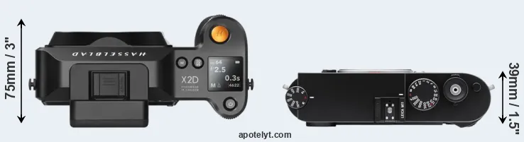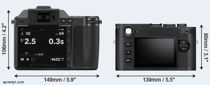 The physical size and weight of the Hasselblad X2D 100C and the Leica M11 are illustrated in the side-by-side display below. The two cameras are presented according to their relative size. Three successive views from the front, the top, and the rear are shown. All width, height and depth measures are rounded to the nearest millimeter.