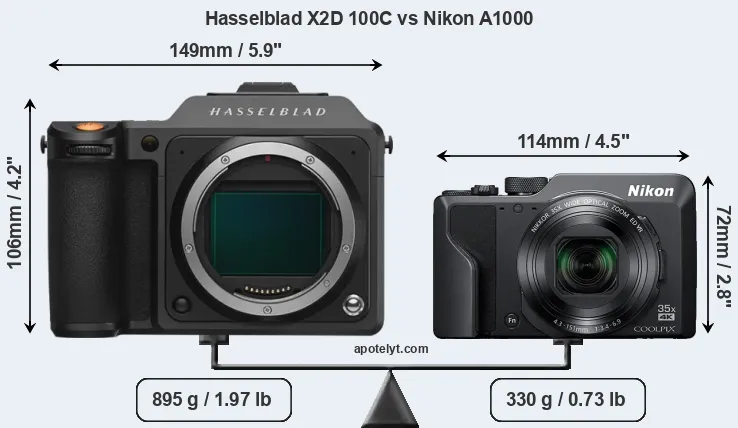 An illustration of the physical size and weight of the Hasselblad X2D 100C and the Nikon A1000 is provided in the side-by-side display below. The two cameras are presented according to their relative size. Three consecutive perspectives from the front, the top, and the back are available. All width, height and depth measures are rounded to the nearest millimeter.