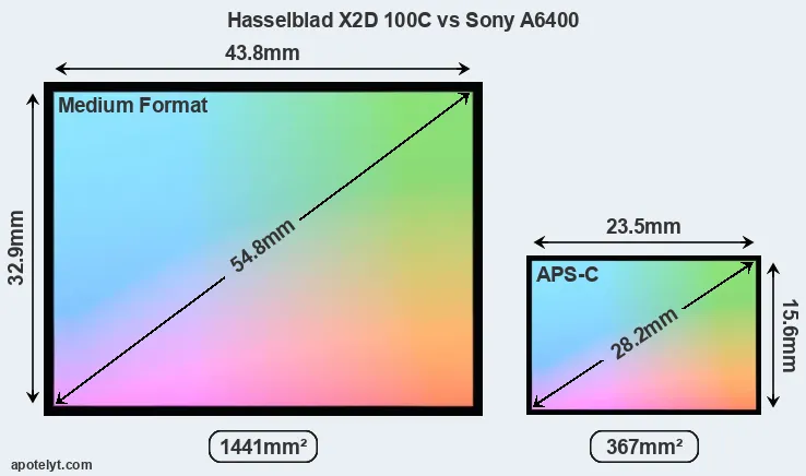 Of the two cameras under consideration, the Hasselblad X2D 100C features a medium format sensor and the Sony A6400 an APS-C sensor. The sensor area in the A6400 is 75 percent smaller. As a result of these sensor size differences, the cameras have a format factor of, respectively, 0.79 and 1.5. The sensor in the X2D 100C has a native 4:3 aspect ratio, while the one in the A6400 offers a 3:2 aspect.