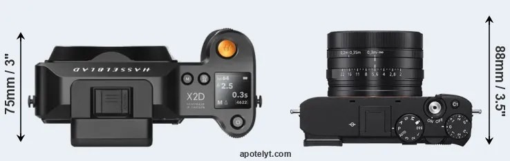 The physical size and weight of the Hasselblad X2D 100C and the Sony RX1R III are illustrated in the side-by-side display below. The two cameras are presented according to their relative size. Three successive views from the front, the top, and the rear are shown. All width, height and depth measures are rounded to the nearest millimeter.