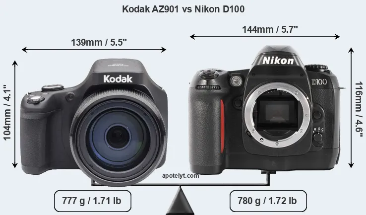 The physical size and weight of the Kodak AZ901 and the Nikon D100 are illustrated in the side-by-side display below. The two cameras are presented according to their relative size. Three consecutive perspectives from the front, the top, and the back are available. All width, height and depth dimensions are rounded to the nearest millimeter.