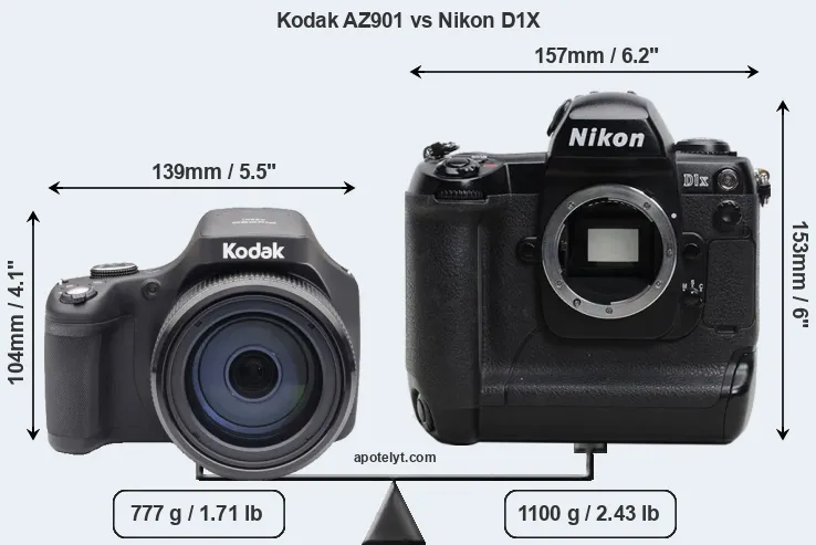 If the front view area (width x height) of the cameras is taken as an aggregate measure of their size, the Nikon D1X is considerably larger (66 percent) than the Kodak AZ901. It is noteworthy in this context that the D1X is splash and dust-proof, while the AZ901 does not feature any corresponding weather-sealing.