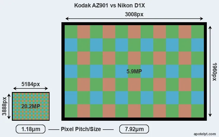 Despite having a smaller sensor, the Kodak AZ901 offers a higher resolution of 20.2 megapixels, compared with 5.9 MP of the Nikon D1X. This megapixels advantage comes at the cost of a higher pixel density and a smaller size of the individual pixel (with a pixel pitch of 1.18μm versus 7.92μm for the D1X). However, it should be noted that the AZ901 is much more recent (by 14 years and 11 months) than the D1X, and its sensor will have benefitted from technological advances during this time that make it possible to gather light more efficiently.