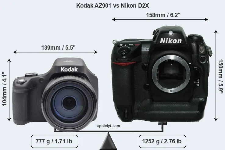 If the front view area (width x height) of the cameras is taken as an aggregate measure of their size, the Nikon D2X is considerably larger (64 percent) than the Kodak AZ901. It is noteworthy in this context that the D2X is splash and dust-proof, while the AZ901 does not feature any corresponding weather-sealing.