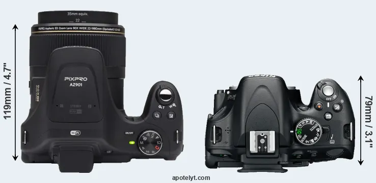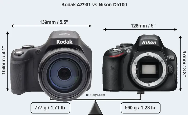 The side-by-side display below illustrates the physical size and weight of the Kodak AZ901 and the Nikon D5100. The two cameras are presented according to their relative size. Three successive views from the front, the top, and the rear are shown. All width, height and depth measures are rounded to the nearest millimeter.