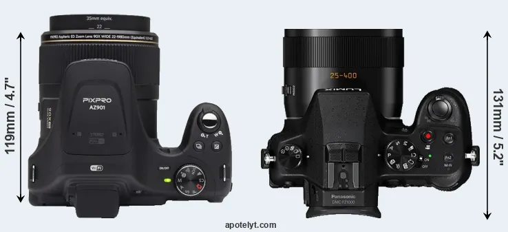 The physical size and weight of the Kodak AZ901 and the Panasonic FZ1000 are illustrated in the side-by-side display below. The two cameras are presented according to their relative size. Three consecutive views from the front, the top, and the rear side are shown. All size dimensions are rounded to the nearest millimeter.