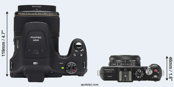 An illustration of the physical size and weight of the Kodak AZ901 and the Panasonic LX7 is provided in the side-by-side display below. The two cameras are presented according to their relative size. Three consecutive views from the front, the top, and the rear side are shown. All width, height and depth dimensions are rounded to the nearest millimeter.