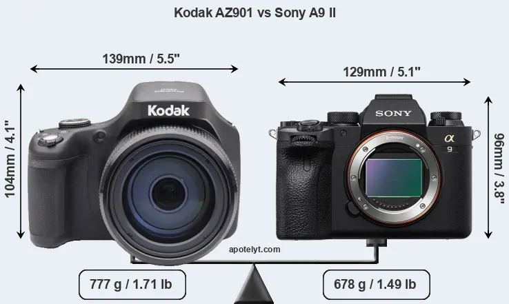 If the front view area (width x height) of the cameras is taken as an aggregate measure of their size, the Sony A9 II is notably smaller (14 percent) than the Kodak AZ901. It is noteworthy in this context that the A9 II is splash and dust-proof, while the AZ901 does not feature any corresponding weather-sealing.