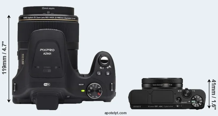 The side-by-side display below illustrates the physical size and weight of the Kodak AZ901 and the Sony RX100 V. The two cameras are presented according to their relative size. Three successive views from the front, the top, and the rear are shown. All width, height and depth measures are rounded to the nearest millimeter.