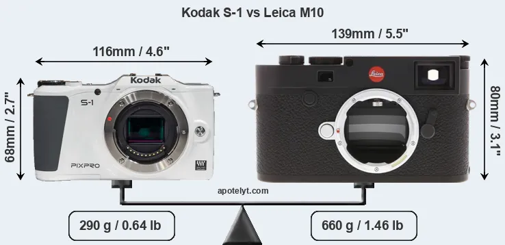 If the front view area (width x height) of the cameras is taken as an aggregate measure of their size, the Leica M10 is notably larger (41 percent) than the Kodak S-1. Moreover, the M10 is substantially heavier (128 percent) than the S-1. It is noteworthy in this context that the M10 is splash and dust-proof, while the S-1 does not feature any corresponding weather-sealing.
