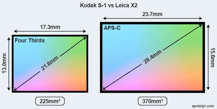 Of the two cameras under consideration, the Kodak S-1 features a Four Thirds sensor and the Leica X2 an APS-C sensor. The sensor area in the X2 is 64 percent bigger. As a result of these sensor size differences, the cameras have a format factor of, respectively, 2.0 and 1.5. The sensor in the S-1 has a native 4:3 aspect ratio, while the one in the X2 offers a 3:2 aspect.
