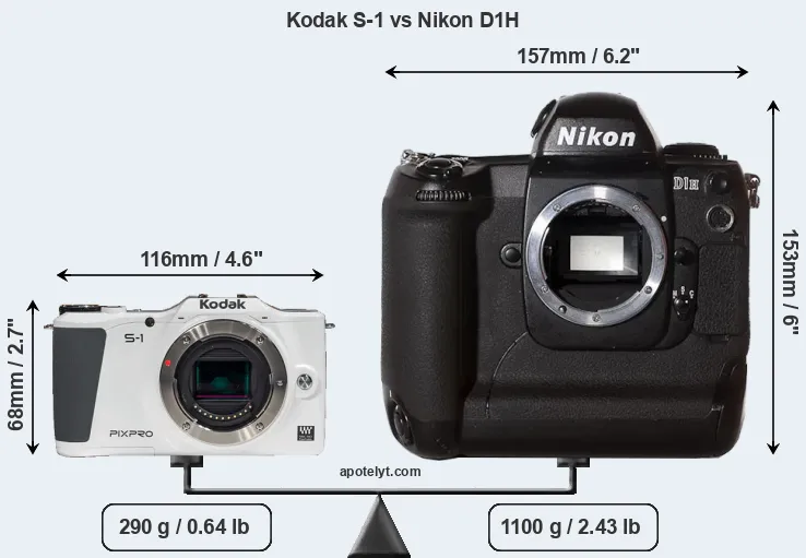 If the front view area (width x height) of the cameras is taken as an aggregate measure of their size, the Nikon D1H is considerably larger (205 percent) than the Kodak S-1. Moreover, the D1H is substantially heavier (279 percent) than the S-1. It is noteworthy in this context that the D1H is splash and dust-proof, while the S-1 does not feature any corresponding weather-sealing.