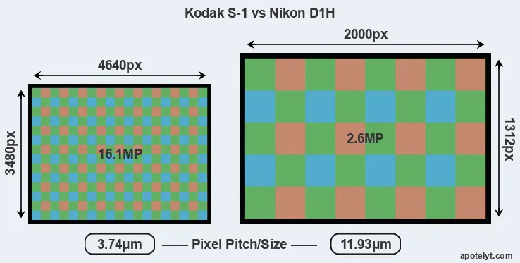 Despite having a smaller sensor, the Kodak S-1 offers a higher resolution of 16.1 megapixels, compared with 2.6 MP of the Nikon D1H. This megapixels advantage comes at the cost of a higher pixel density and a smaller size of the individual pixel (with a pixel pitch of 3.74μm versus 11.93μm for the D1H). However, it should be noted that the S-1 is much more recent (by 10 years and 11 months) than the D1H, and its sensor will have benefitted from technological advances during this time that make it possible to gather light more efficiently.