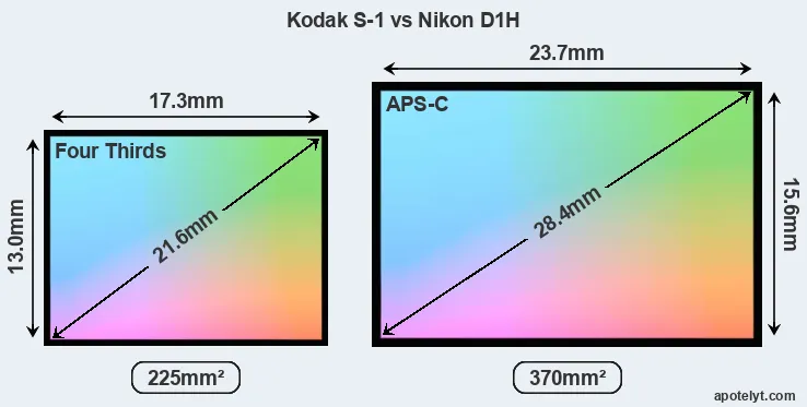 Of the two cameras under consideration, the Kodak S-1 features a Four Thirds sensor and the Nikon D1H an APS-C sensor. The sensor area in the D1H is 64 percent bigger. As a result of these sensor size differences, the cameras have a format factor of, respectively, 2.0 and 1.5. The sensor in the S-1 has a native 4:3 aspect ratio, while the one in the D1H offers a 3:2 aspect.