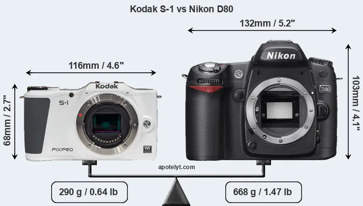 If the front view area (width x height) of the cameras is taken as an aggregate measure of their size, the Nikon D80 is considerably larger (72 percent) than the Kodak S-1. Moreover, the D80 is substantially heavier (130 percent) than the S-1. In this context, it is worth noting that neither the S-1 nor the D80 are weather-sealed.