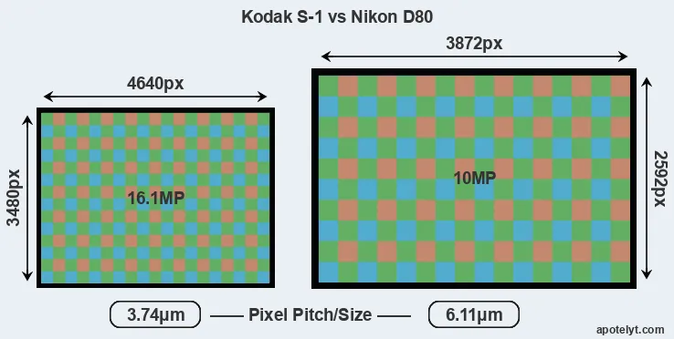 Despite having a smaller sensor, the Kodak S-1 offers a higher resolution of 16.1 megapixels, compared with 10 MP of the Nikon D80. This megapixels advantage comes at the cost of a higher pixel density and a smaller size of the individual pixel (with a pixel pitch of 3.74μm versus 6.11μm for the D80). However, it should be noted that the S-1 is much more recent (by 5 years and 5 months) than the D80, and its sensor will have benefitted from technological advances during this time that make it possible to gather light more efficiently.