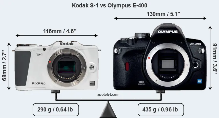 The physical size and weight of the Kodak S-1 and the Olympus E-400 are illustrated in the side-by-side display below. The two cameras are presented according to their relative size. Three consecutive views from the front, the top, and the rear side are shown. All width, height and depth measures are rounded to the nearest millimeter.