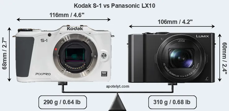 The Kodak PixPro S-1 and the Panasonic Lumix DMC-LX10 (labelled Panasonic LX15 in some countries) are two digital cameras that were revealed to the public, respectively, in January 2012 and September 2016. The S-1 is a mirrorless interchangeable lens camera, while the LX10 is a fixed lens compact. The cameras are based on a Four Thirds (S-1) and an one-inch (LX10) sensor. The Kodak has a resolution of 16.1 megapixels, whereas the Panasonic provides 20 MP.