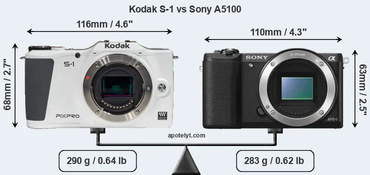 The side-by-side display below illustrates the physical size and weight of the Kodak S-1 and the Sony A5100. The two cameras are presented according to their relative size. Three successive views from the front, the top, and the rear are shown. All size dimensions are rounded to the nearest millimeter.