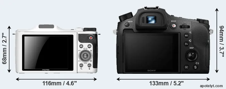 If the front view area (width x height) of the cameras is taken as an aggregate measure of their size, the Sony RX10 IV is considerably larger (58 percent) than the Kodak S-1. It is noteworthy in this context that the RX10 IV is splash and dust-proof, while the S-1 does not feature any corresponding weather-sealing.