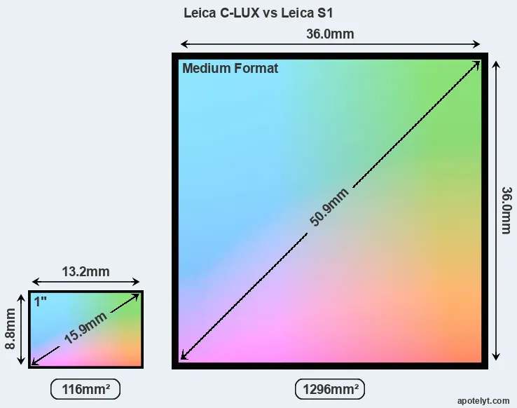 Of the two cameras under consideration, the Leica C-LUX features an one-inch sensor and the Leica S1 a medium format sensor. The sensor area in the S1 is 1017 percent bigger. As a result of these sensor size differences, the cameras have a format factor of, respectively, 2.7 and 0.85. The sensor in the C-LUX has a native 3:2 aspect ratio, while the one in the S1 offers a 1:1 aspect.
