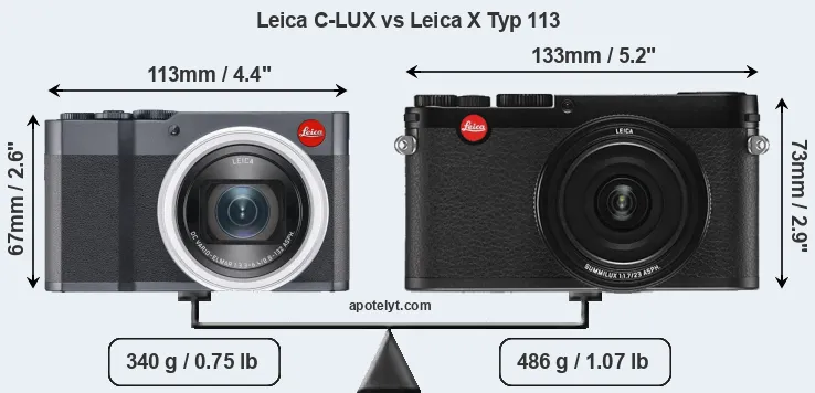 The physical size and weight of the Leica C-LUX and the Leica X Typ 113 are illustrated in the side-by-side display below. The two cameras are presented according to their relative size. Three consecutive perspectives from the front, the top, and the back are available. All width, height and depth measures are rounded to the nearest millimeter.