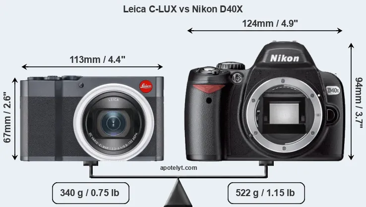 If the front view area (width x height) of the cameras is taken as an aggregate measure of their size, the Nikon D40X is considerably larger (54 percent) than the Leica C-LUX. In this context, it is worth noting that neither the C-LUX nor the D40X are weather-sealed.