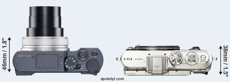 If the front view area (width x height) of the cameras is taken as an aggregate measure of their size, the Olympus E-PL8 is somewhat larger (2 percent) than the Leica C-LUX. In this context, it is worth noting that neither the C-LUX nor the E-PL8 are weather-sealed.