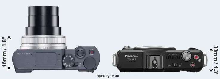 The physical size and weight of the Leica C-LUX and the Panasonic GF2 are illustrated in the side-by-side display below. The two cameras are presented according to their relative size. Three consecutive perspectives from the front, the top, and the back are available. All width, height and depth measures are rounded to the nearest millimeter.