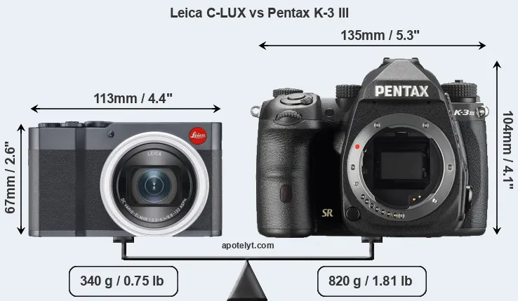 An illustration of the physical size and weight of the Leica C-LUX and the Pentax K-3 III is provided in the side-by-side display below. The two cameras are presented according to their relative size. Three successive views from the front, the top, and the rear are shown. All width, height and depth measures are rounded to the nearest millimeter.