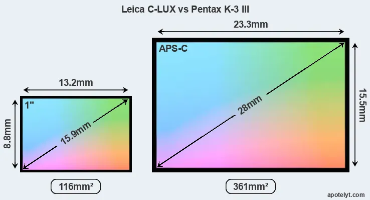 Of the two cameras under consideration, the Leica C-LUX features an one-inch sensor and the Pentax K-3 III an APS-C sensor. The sensor area in the K-3 III is 211 percent bigger. As a result of these sensor size differences, the cameras have a format factor of, respectively, 2.7 and 1.5. Both cameras have a native aspect ratio (sensor width to sensor height) of 3:2.