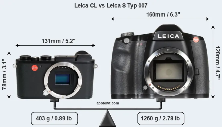 If the front view area (width x height) of the cameras is taken as an aggregate measure of their size, the Leica S Typ 007 is considerably larger (88 percent) than the Leica CL. Moreover, the S Typ 007 is substantially heavier (213 percent) than the CL. It is noteworthy in this context that the S Typ 007 is splash and dust-proof, while the CL does not feature any corresponding weather-sealing.