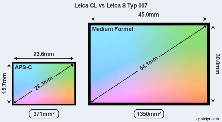 Of the two cameras under consideration, the Leica CL features an APS-C sensor and the Leica S Typ 007 a medium format sensor. The sensor area in the S Typ 007 is 264 percent bigger. As a result of these sensor size differences, the cameras have a format factor of, respectively, 1.5 and 0.8. Both cameras have a native aspect ratio (sensor width to sensor height) of 3:2.