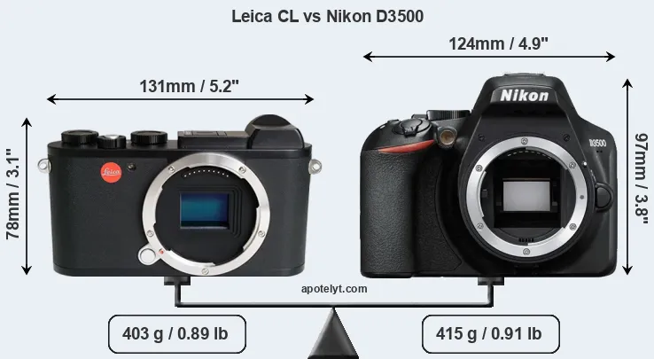 The physical size and weight of the Leica CL and the Nikon D3500 are illustrated in the side-by-side display below. The two cameras are presented according to their relative size. Three successive views from the front, the top, and the rear are shown. All width, height and depth dimensions are rounded to the nearest millimeter.