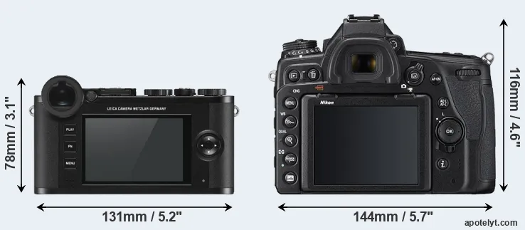 The side-by-side display below illustrates the physical size and weight of the Leica CL and the Nikon D780. The two cameras are presented according to their relative size. Three consecutive perspectives from the front, the top, and the back are available. All size dimensions are rounded to the nearest millimeter.