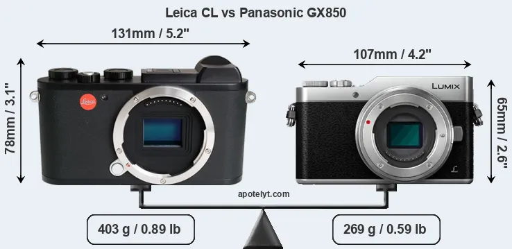 An illustration of the physical size and weight of the Leica CL and the Panasonic GX850 is provided in the side-by-side display below. The two cameras are presented according to their relative size. Three consecutive views from the front, the top, and the rear side are shown. All width, height and depth dimensions are rounded to the nearest millimeter.