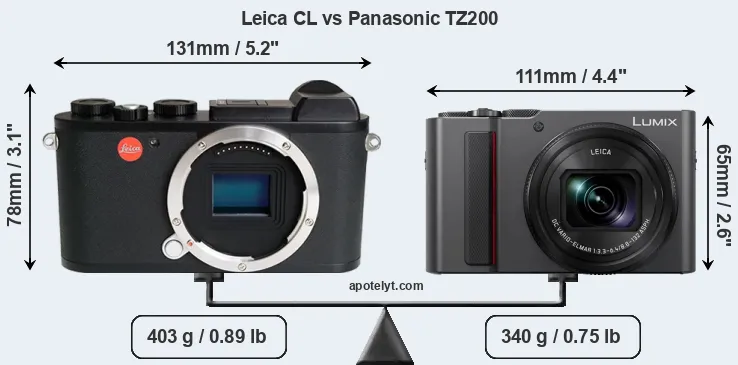 The physical size and weight of the Leica CL and the Panasonic TZ200 are illustrated in the side-by-side display below. The two cameras are presented according to their relative size. Three successive views from the front, the top, and the rear are shown. All size dimensions are rounded to the nearest millimeter.