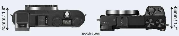 If the front view area (width x height) of the cameras is taken as an aggregate measure of their size, the Sony NEX-7 is notably smaller (21 percent) than the Leica CL. Moreover, the NEX-7 is slightly lighter (1 percent) than the CL. In this context, it is worth noting that neither the CL nor the NEX-7 are weather-sealed.