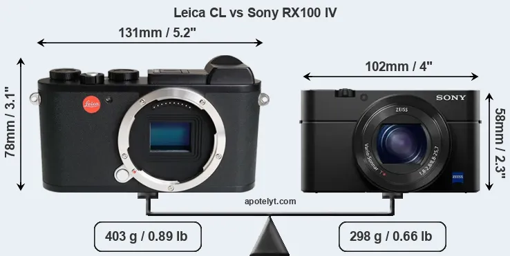 An illustration of the physical size and weight of the Leica CL and the Sony RX100 IV is provided in the side-by-side display below. The two cameras are presented according to their relative size. Three consecutive views from the front, the top, and the rear side are shown. All width, height and depth measures are rounded to the nearest millimeter.