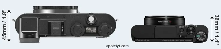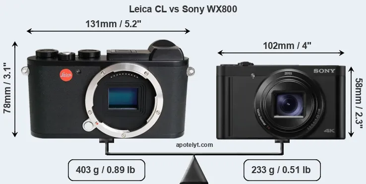 The side-by-side display below illustrates the physical size and weight of the Leica CL and the Sony WX800. The two cameras are presented according to their relative size. Three successive views from the front, the top, and the rear are shown. All width, height and depth measures are rounded to the nearest millimeter.