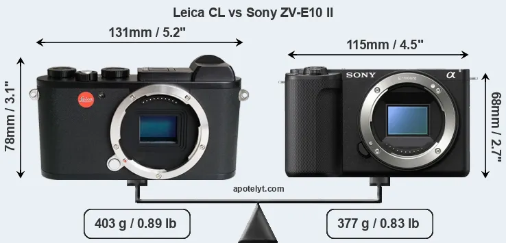 If the front view area (width x height) of the cameras is taken as an aggregate measure of their size, the Sony ZV-E10 II is notably smaller (23 percent) than the Leica CL. Moreover, the ZV-E10 II is markedly lighter (6 percent) than the CL. In this context, it is worth noting that neither the CL nor the ZV-E10 II are weather-sealed.