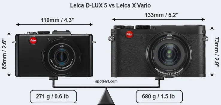 If the front view area (width x height) of the cameras is taken as an aggregate measure of their size, the Leica X Vario is notably larger (36 percent) than the Leica D-LUX 5. Moreover, the X Vario is substantially heavier (151 percent) than the D-LUX 5. In this context, it is worth noting that neither the D-LUX 5 nor the X Vario are weather-sealed.