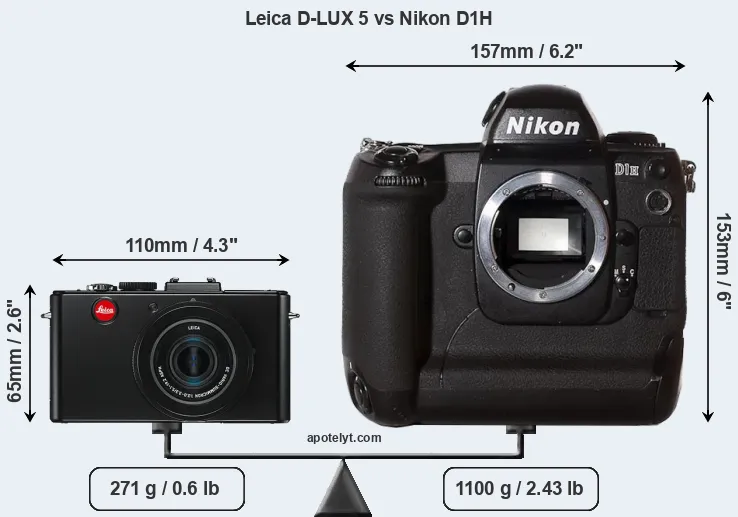 If the front view area (width x height) of the cameras is taken as an aggregate measure of their size, the Nikon D1H is considerably larger (236 percent) than the Leica D-LUX 5. It is noteworthy in this context that the D1H is splash and dust-proof, while the D-LUX 5 does not feature any corresponding weather-sealing.