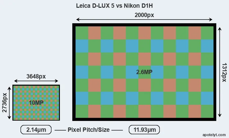 Despite having a smaller sensor, the Leica D-LUX 5 offers a higher resolution of 10 megapixels, compared with 2.6 MP of the Nikon D1H. This megapixels advantage comes at the cost of a higher pixel density and a smaller size of the individual pixel (with a pixel pitch of 2.14μm versus 11.93μm for the D1H). However, it should be noted that the D-LUX 5 is much more recent (by 9 years and 7 months) than the D1H, and its sensor will have benefitted from technological advances during this time that make it possible to gather light more efficiently.