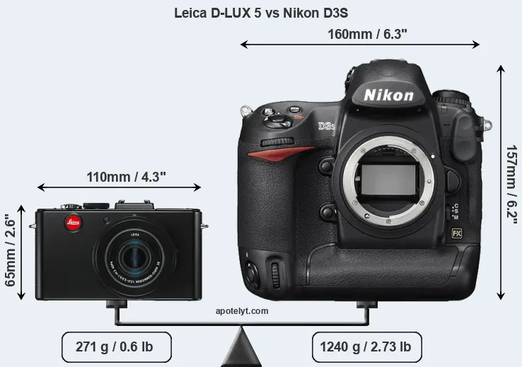 The above size and weight comparisons are to some extent incomplete and possibly misleading, as the D-LUX 5 has a lens built in, whereas the D3S is an interchangeable lens camera that requires a separate lens. Attaching the latter will add extra weight and bulk to the setup. You can compare the optics available for the D3S and their specifications in the Nikon Lens Catalog.