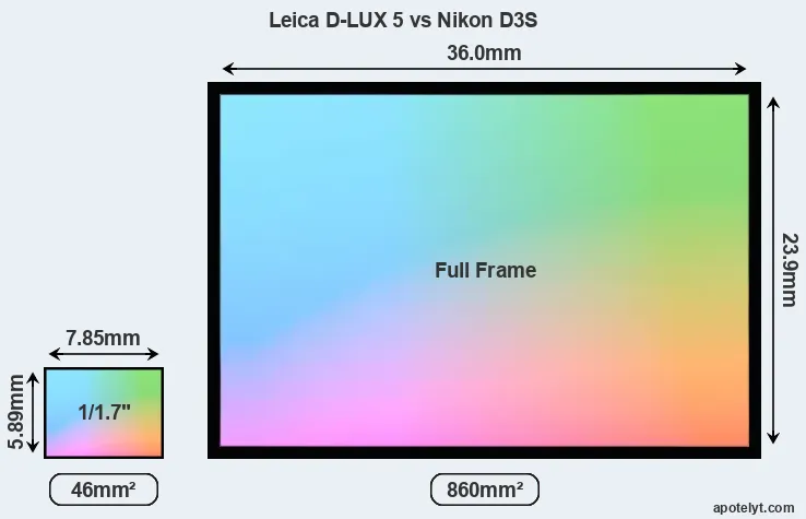 Of the two cameras under consideration, the Leica D-LUX 5 features a 1/1.7-inch sensor and the Nikon D3S a full frame sensor. The sensor area in the D3S is 1770 percent bigger. As a result of these sensor size differences, the cameras have a format factor of, respectively, 4.4 and 1.0. The sensor in the D-LUX 5 has a native 4:3 aspect ratio, while the one in the D3S offers a 3:2 aspect. The D-LUX 5 has the particularity of featuring a switch that allows to toggle between multiple aspect ratios, while maintaining the same field of view and full image resolution.