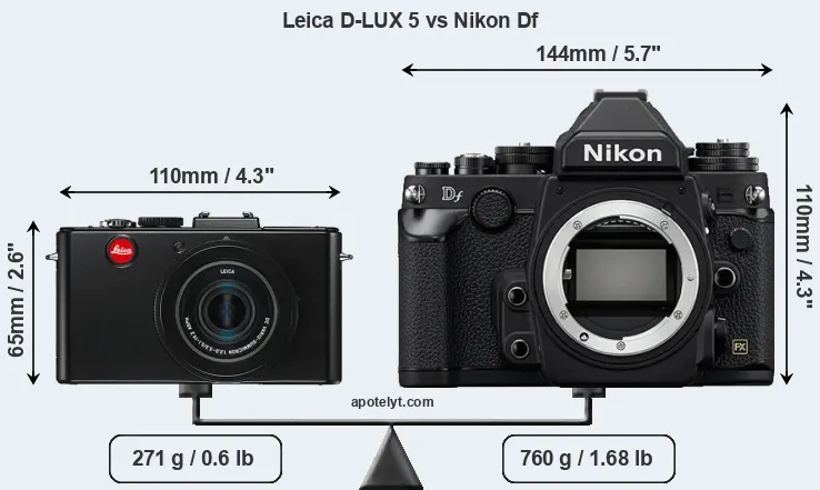 The side-by-side display below illustrates the physical size and weight of the Leica D-LUX 5 and the Nikon Df. The two cameras are presented according to their relative size. Three consecutive perspectives from the front, the top, and the back are available. All size dimensions are rounded to the nearest millimeter.