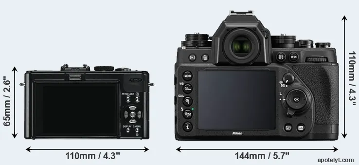 The above size and weight comparisons are to some extent incomplete and possibly misleading, as the D-LUX 5 has a lens built in, whereas the Df is an interchangeable lens camera that requires a separate lens. Attaching the latter will add extra weight and bulk to the setup. You can compare the optics available for the Df and their specifications in the Nikon Lens Catalog.